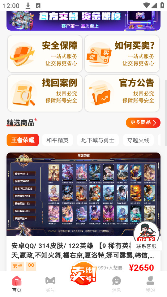 《17账号游戏交易平台》是一款专为游戏玩家设计的账号交易软件,玩家可以在该平台上买卖游戏账号,涵盖了王者荣耀、穿越火线等众多热门游戏。平台提供了找回包赔等安全保障措施,确保玩家的交易安全。除了账号交易外,平台还提供了丰富的游戏资讯和攻略,帮助玩家更好地了解游戏动态和提升游戏水平。平台上的游戏账号均来自正规渠道,玩家可以放心交易。