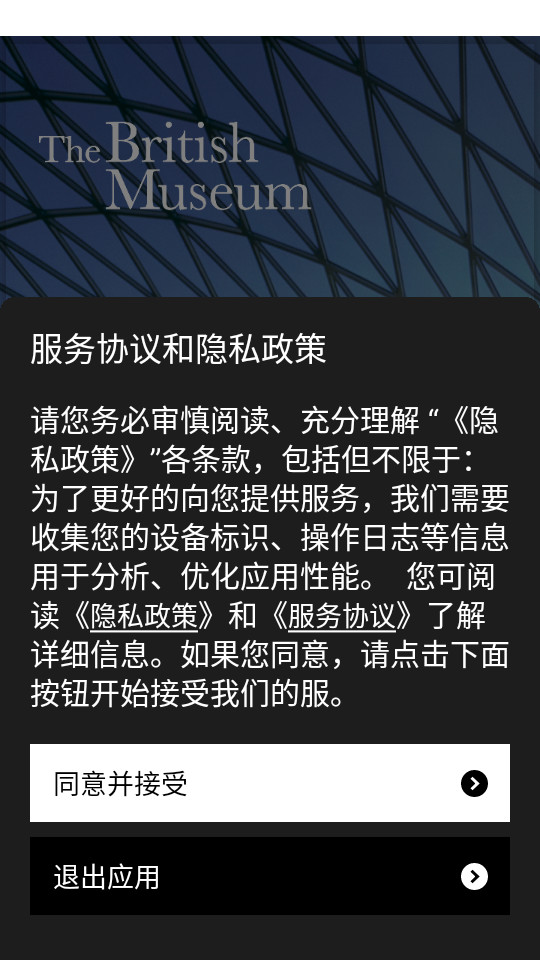1.下载安装并打开大英博物馆app,点击【同意并接受】