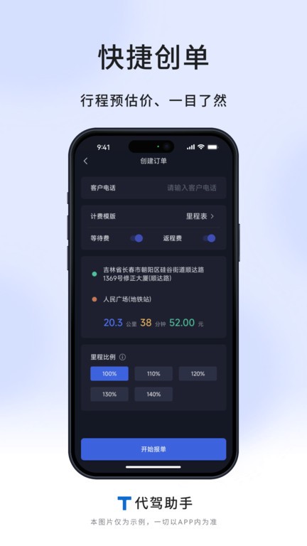 3、司机可选择不同的主题、行程比例、计费模板创建订单,并在代驾过程中实时显示行驶数据与费用,支持适当的里程纠偏,为代驾师傅提供便捷的服务。