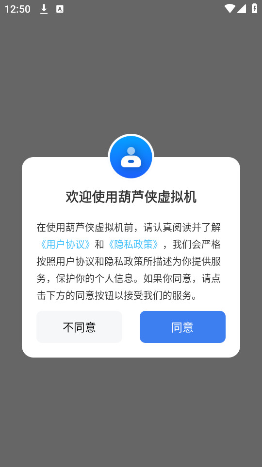 1.下载安装并打开葫芦侠虚拟机app,点击【同意】同意隐私政策