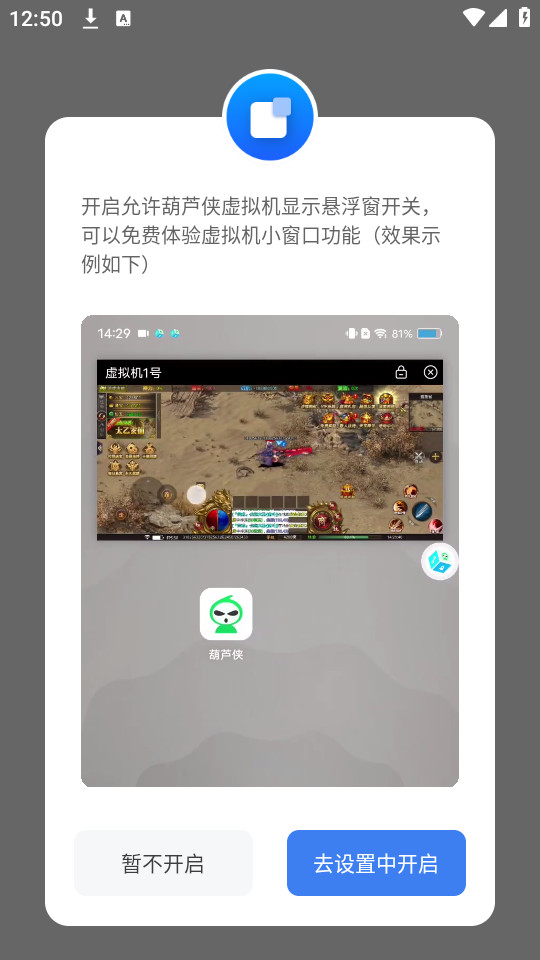 5.完成之后回到葫芦侠虚拟机,按照视频教程开启悬浮窗,点击【去设置中开启】