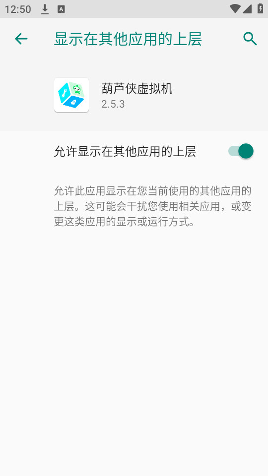 6.找到葫芦侠虚拟机app之后,打开【允许显示在其他应用的上层】