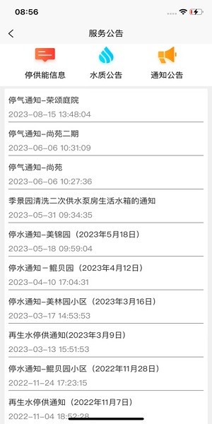 4、用户通过软件可以看到各种停供能信息,提前做好停水停气等的应对措施;