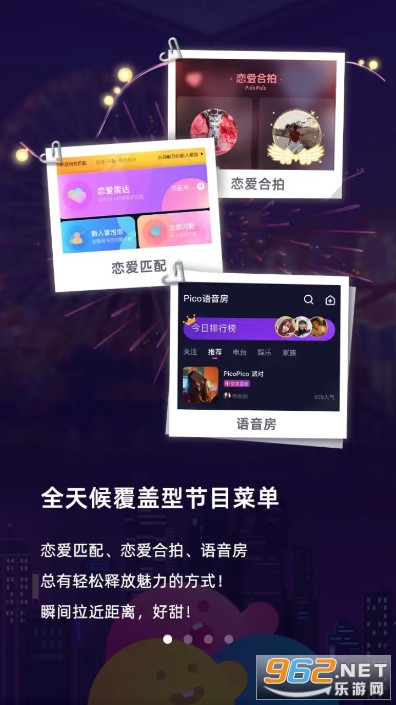乐园入口处设置了恋爱雷达,帮你24小时搜索新匹配,海量异性、聊天秒回,还能直接1v1语音连麦,零距离互动,聊天交友,甜甜的停不下来。