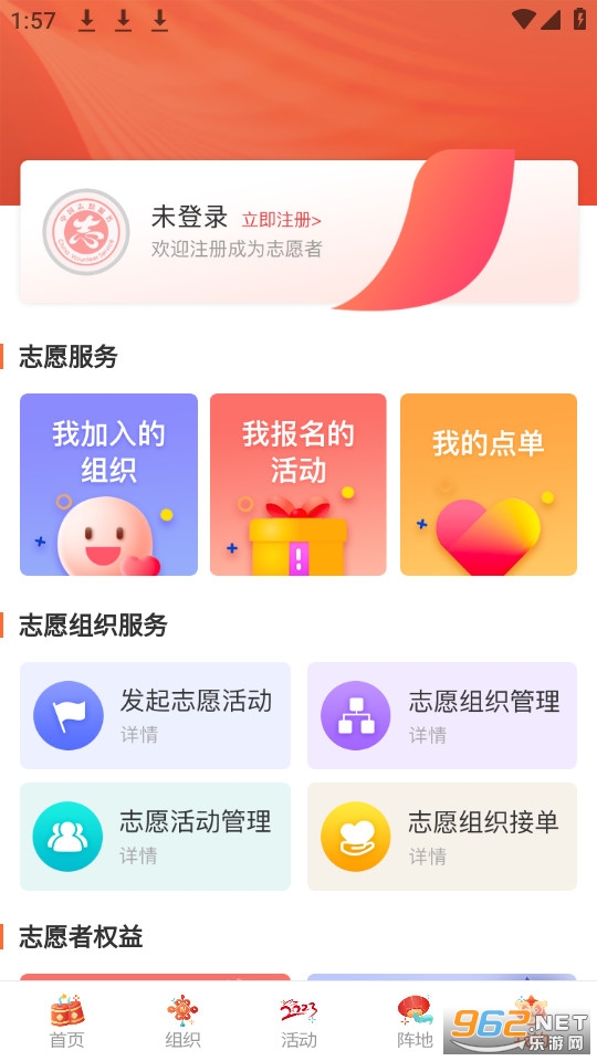 1、打开并登入志愿山东app,进入【首页】点击【志愿者注册】(下图黄色箭头所指区域)