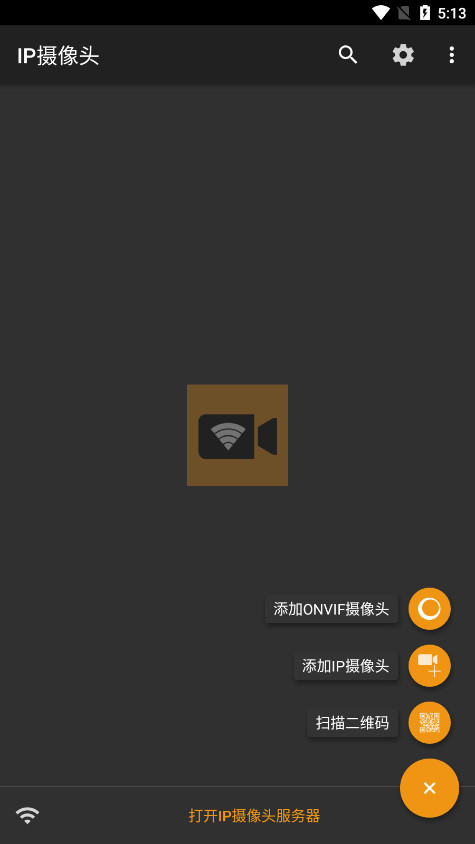 1. 首先我们打开手机,连上wifi(要保证监控端和查看端在同一个局域网内),然后打开IP摄像头,点击右上角的齿轮图标进入设置界面