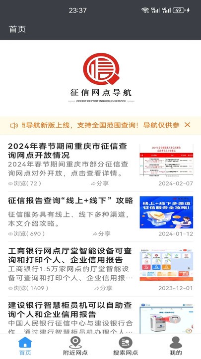 征信网点导航app官方版是一个好用的征信查询软件,大家可以通过app来进行查询相关的人群征信,能够进行征信打印,非常适合大家日常需求,欢迎各位感兴趣的朋友们下载使用。