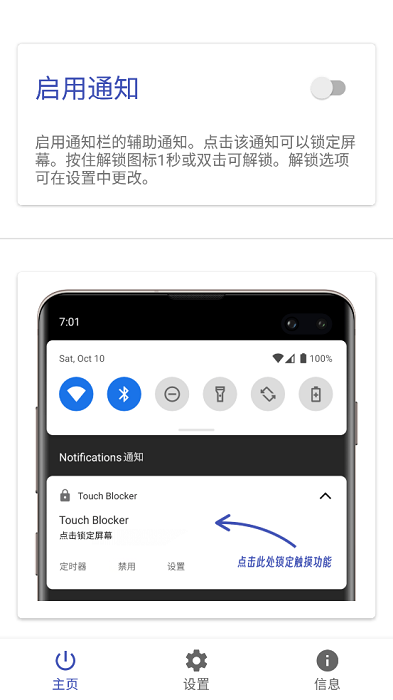 2.在主页中开启【启用通知】,点击可以锁定屏幕;