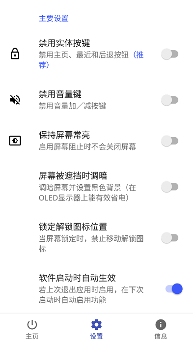 软件功能丰富,包括禁用实体按键、禁用音量键、保持屏幕常亮、屏幕被遮挡时调暗、方向旋转锁定和定时等功能。