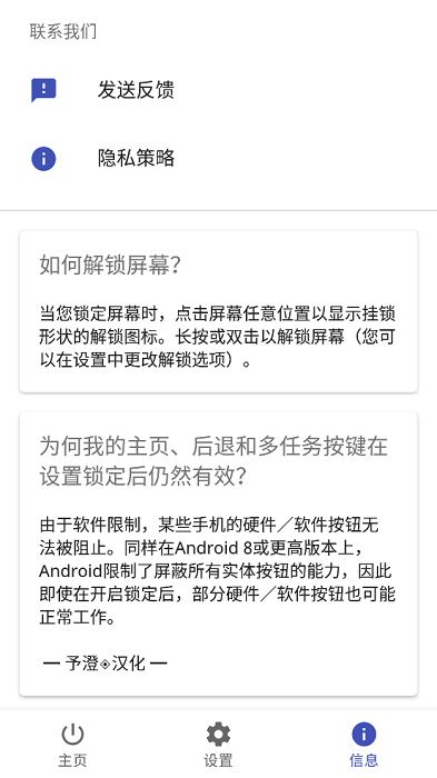 软件支持多种锁定与解锁工具,体积小巧,功能简单。原理简单,无需root,仅屏蔽触摸无特殊要求,屏蔽按键需开启无障碍服务。