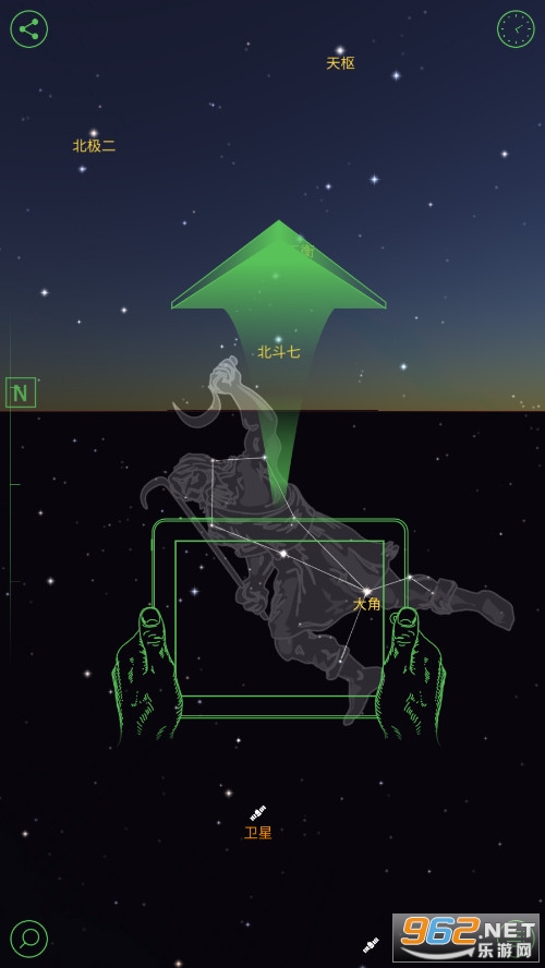 用手拿住手机,让手机直立,屏幕朝向自己的眼睛。然后将手机往自己的脑袋上方快速上下晃动几下。就可以进入实时显示星空模式。这是只要将手机背面朝向任何一个方向,你都可以在屏幕上实时地看到该方向区域的星空。