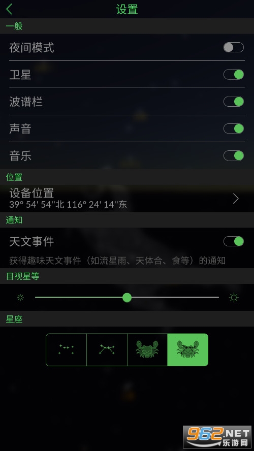 可以设置夜景模式、卫星显示、背景音乐等的打开与关闭,可以设置位置,还可以设置星座连线及图案的显示模式。常用的设置如图3所示。