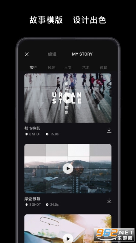 在全新的Story模式下,您只需选择模板,灵眸口袋云台相机将自动进行拍摄、剪辑和配乐。炫酷的自动运镜,丰富的音乐库,真正实现一键出片!