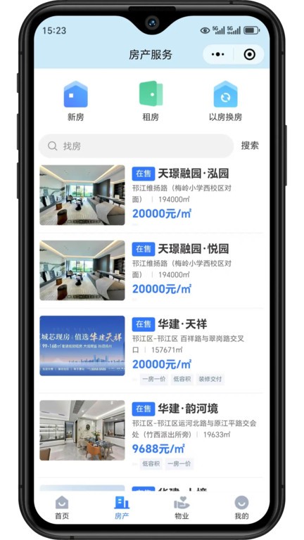 1、首页进入房产服务栏目,查看各类房源分类信息。