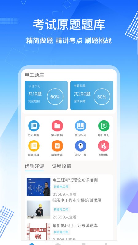 电工证考通app官方软件最新版本为电工提供了备考服务,汇集了各种考试原题以及历年真题资源,支持练习和测试,超多精品好课任你学,能够收藏喜欢的课程,还能学习考试技巧,支持创建自己的错题本,反复练习,查漏补缺,击破盲点。