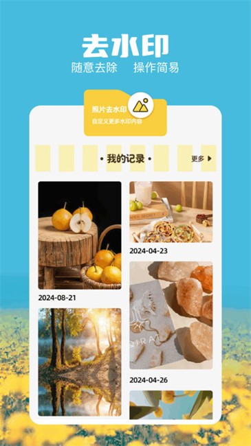 能轻松去除照片水印,也可自定义添加或批量加水印,提供库存盘点、考勤打卡等多种水印模板。