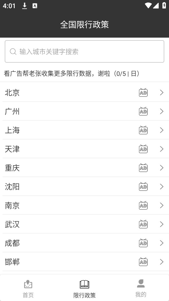 5、全国限行区:点击即可查询全国近百个城市限行数据,更多限行数据整理中