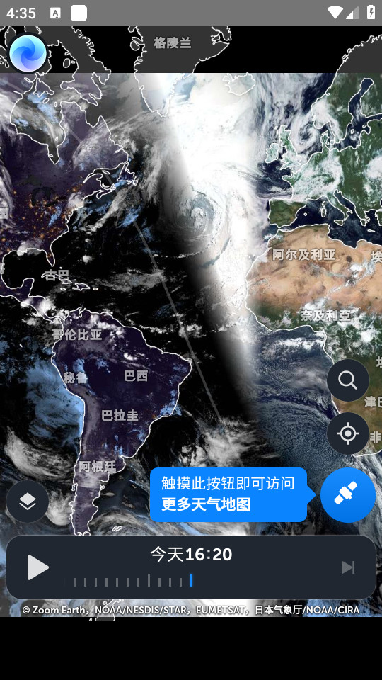 1.下载安装zoomearth app并打开,点击卫星标识可以查看详细的天气图,可以根据你的需求对各种不同的天气进行选择,查看基本的天气情况