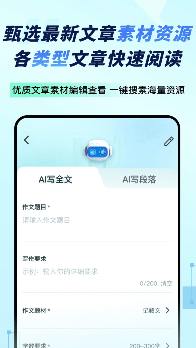 海量素材:还提供丰富的写作素材,包括文章开头、结尾、论点、论据、例子等。都可以为你的文章锦上添花。