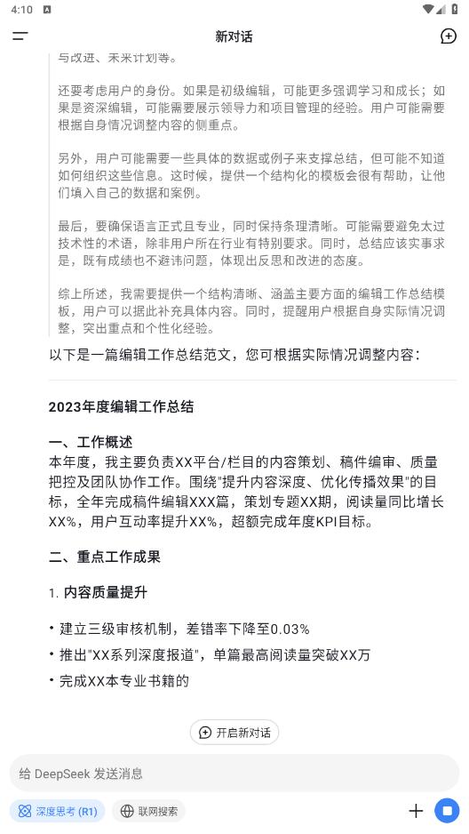 报告创作:对于职场人士来说,撰写工作报告、市场调研报告等往往是一项繁琐的任务。DeepSeek可以根据提供的数据和要求,生成专业的报告框架和内容。比如输入某产品的销售数据、市场调研结果以及分析要求,它能生成一份包含数据图表分析、市场趋势预测、建议措施等内容的完整报告,为工作提供有力支持。