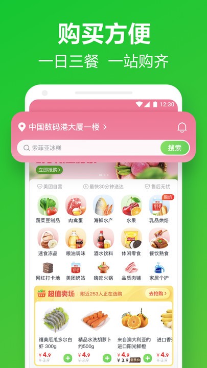 3、齐全商品品类,汇集蔬菜水果、肉禽蛋品、粮油调味、海鲜水产等商品,轻松备齐所需材料。