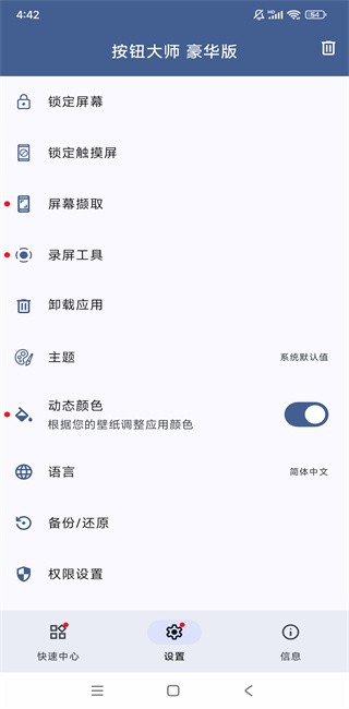 按钮大师安卓版app豪华版能够进行按键控制,支持设置各种快捷按键和手势指令,可以用此软件来替代手机的按键功能,支持悬浮显示,可以任意拖动位置,主屏幕、物理以及通知栏按钮均可设置,可以添加多个悬浮球。