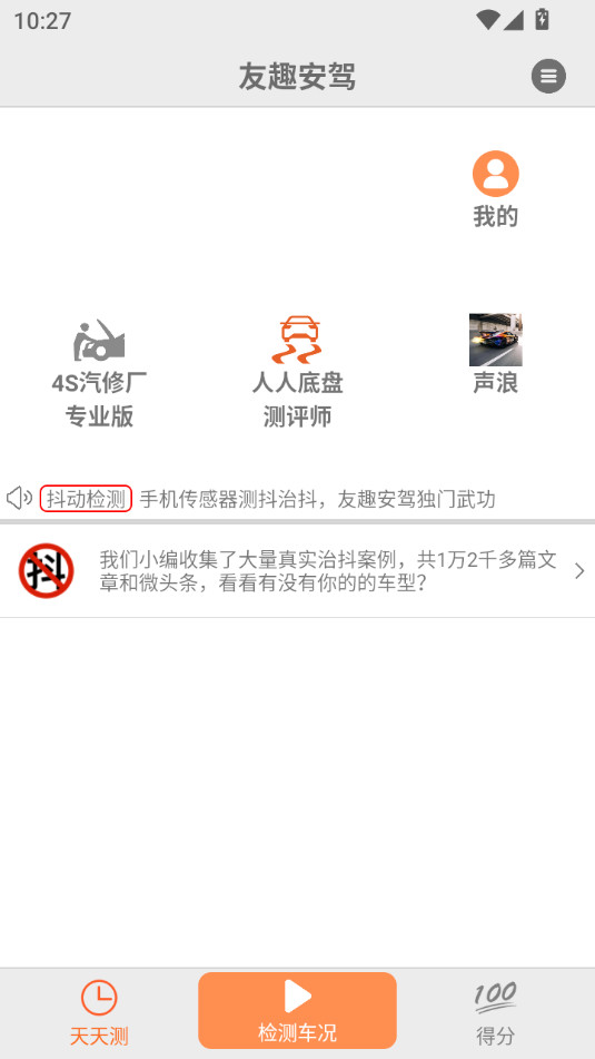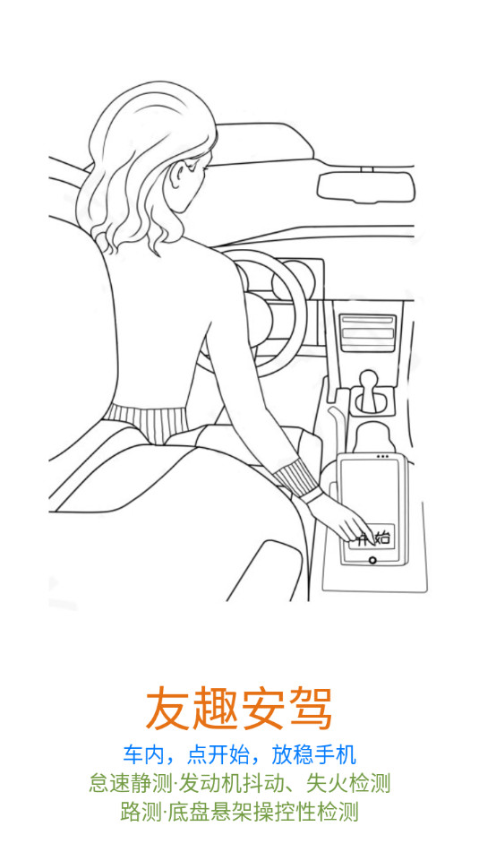 友趣安驾——通过手机麦克风和传感器,利用汽车NVH算法,通过声音和振动检测车况和发动机心电图,新车、二手车必检;