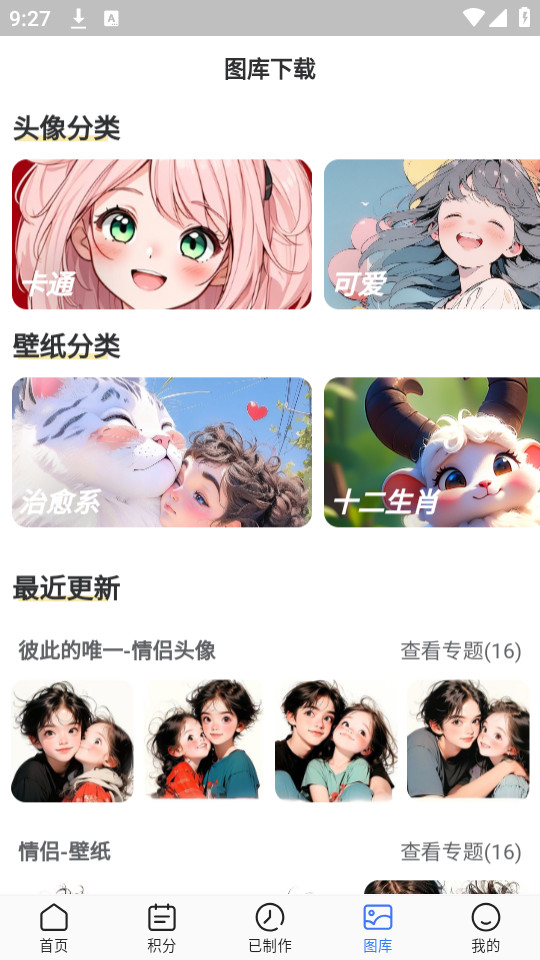 图库界面还能够在各种不同的分类下面选择你喜欢的图片,不同分类的头像壁纸应有尽有