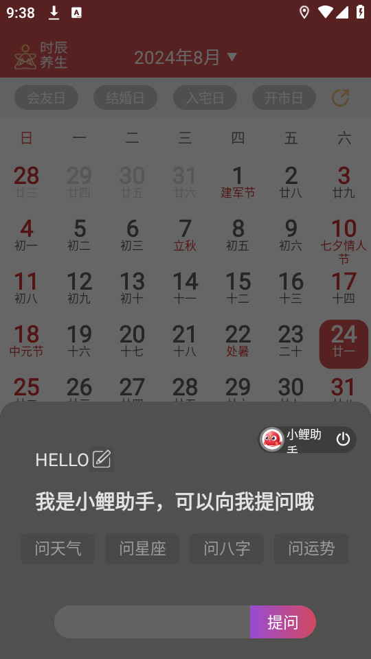 《锦鲤万年历无广告版》是一款集日历、农历、记事、提醒等多种功能于一身的生活助手类应用,它融合了中华传统文化与现代科技,为用户提供了便捷、全面的日期查询和日程管理体验。提供黄历宜忌、节日节气、吉日查询、旧历查询等功能,让用户随时掌握日期信息,合理安排日程。支持农历、公历随意切换,方便用户查询传统节日、节气等重要日期。提供天气动态、未来一周天气、PM2.5污染提示以及生活指数提醒等,让用户随时了解天气变化,做好出行准备。融入了中国传统老黄历的吉凶宜忌、择吉日等信息,满足用户对传统文化的需求。