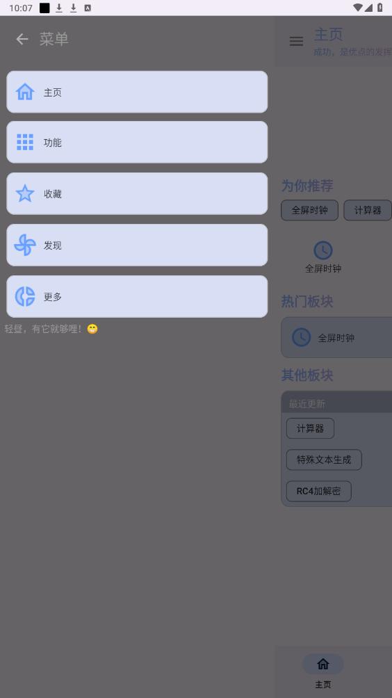 在主页,你可以快速选择你所需要的功能,比如全屏时钟