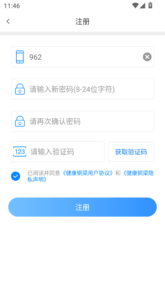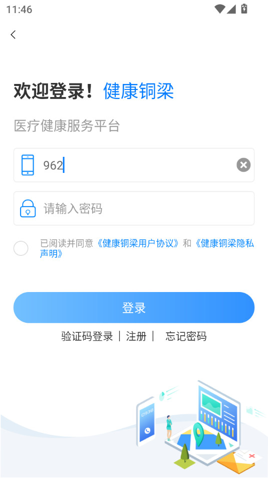 下载安装并打开健康铜梁app,勾选用户协议,点击确定