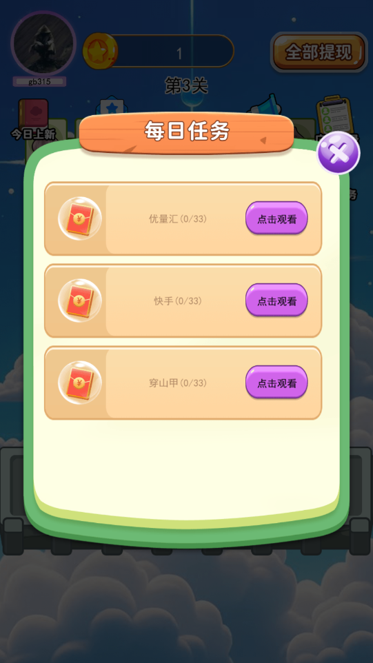 通过闯关,看视频,完成任务赚钱,辉云助手是三消玩法的游戏,可以选择闯关看视频,也可以直接去『每日任务』里面选择一个渠道看视频。反正不管你的手机权重如何,奖励都不会变的(目前),选择简单的方式即可。