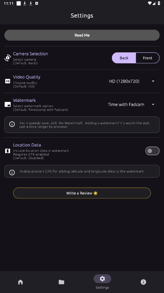 设置界面,可以设置摄像头前置或者后置,视频分辨率,水印,定位等等