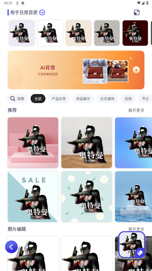 大量的背景素材,一键换模板,一秒换布景,快咔就是你移动的专业商品摄影师