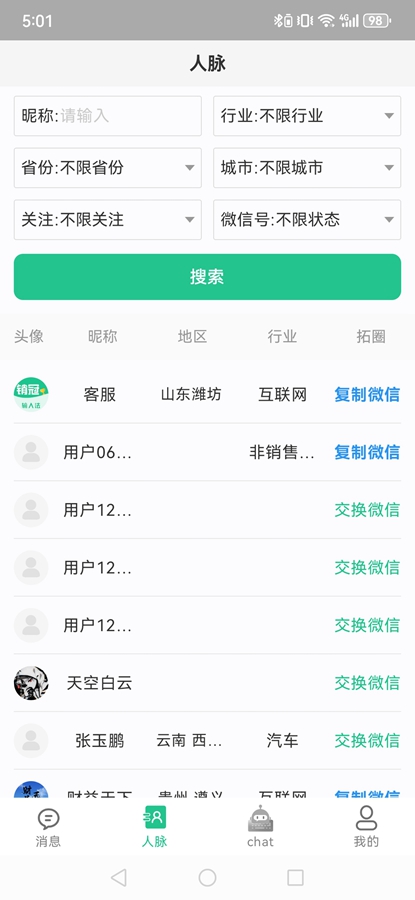 二、社交&拓客:支持人脉搜索、交换、即时通讯等