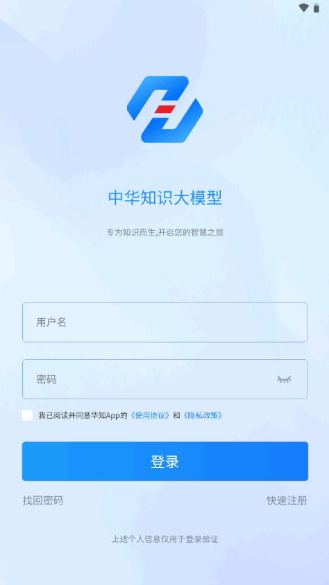 打开华知大模型app,同意相关协议,进入登录界面,点击快速注册