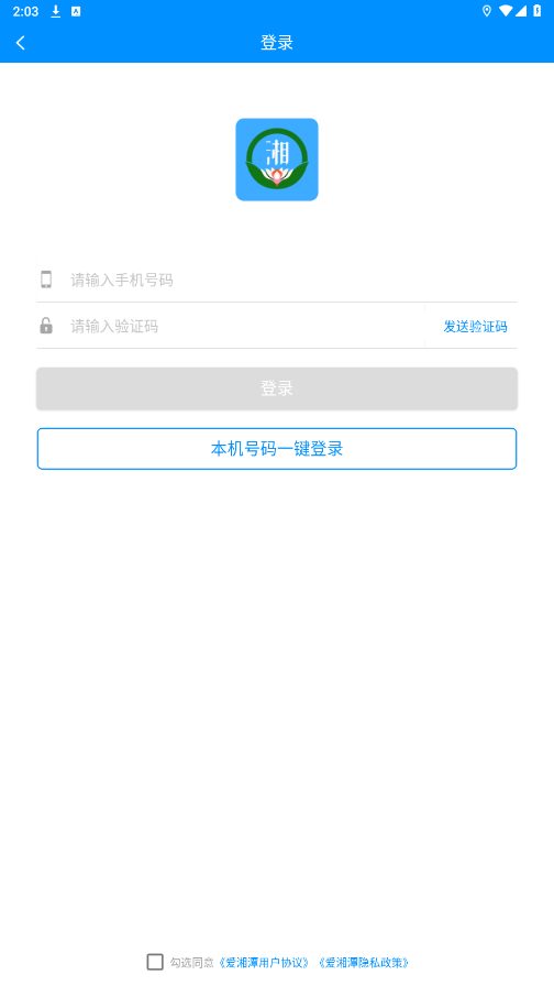 打开爱湘潭app,点击勾选用户协议和隐私协议