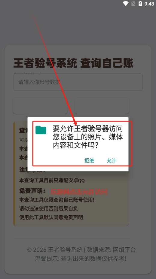 1、下载乐游网962本站提供的王者数据号验号器软件,授予应用访问权限点击“允许”