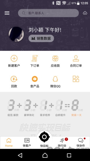 4、追踪目标进展 将销售目标拆解为具体的业务行动通过快行动记录每天工作推进情况确保目标有可靠的实现路线。