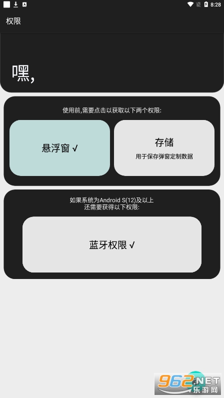 1.启动APP后点击左侧悬浮窗按钮,点击后将跳转至系统显示在其他应用的上层设置,点击开关按钮开启该权限,完成后返回APP界面,发现悬浮窗按钮右侧出现√,即为权限获取成功。
