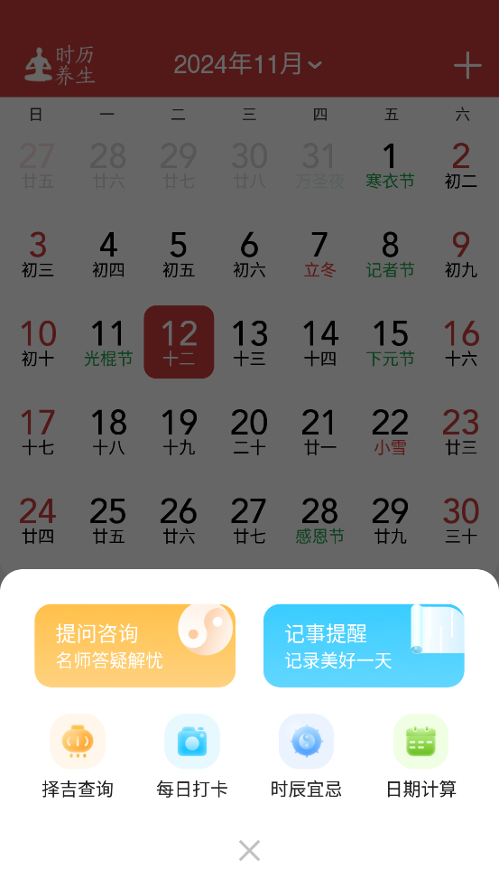 1、日历:农历黄历随便看,假日节气道道全。
