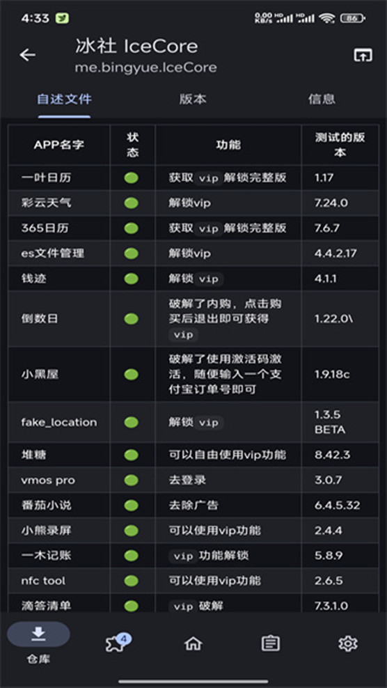 冰社模块,一款专为Android用户打造的Xposed插件,集成了众多实用功能,旨在优化应用体验。它支持多款热门应用,如日历、天气、文件管理、记账等,通过破解VIP权限、去除广告等方式,让用户享受更纯净、更高级的服务。