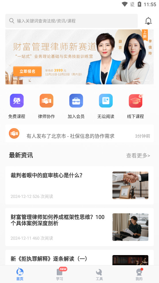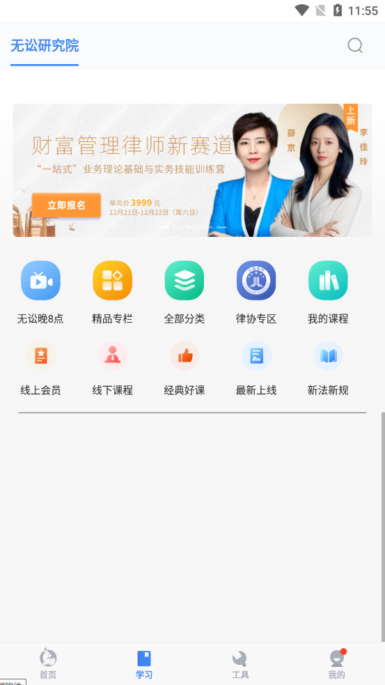 无讼学院:邀请业内权威师资,打造法律人的专业学习课堂,直播课程、视频课程、线下面授等丰富课程形式,涵盖民法精解、刑事辩护、商经前沿、行业观察等多个领域,与法律人共成长。晚8点直播课,与律界大咖在线0距离互动,直播结束支持课程回看