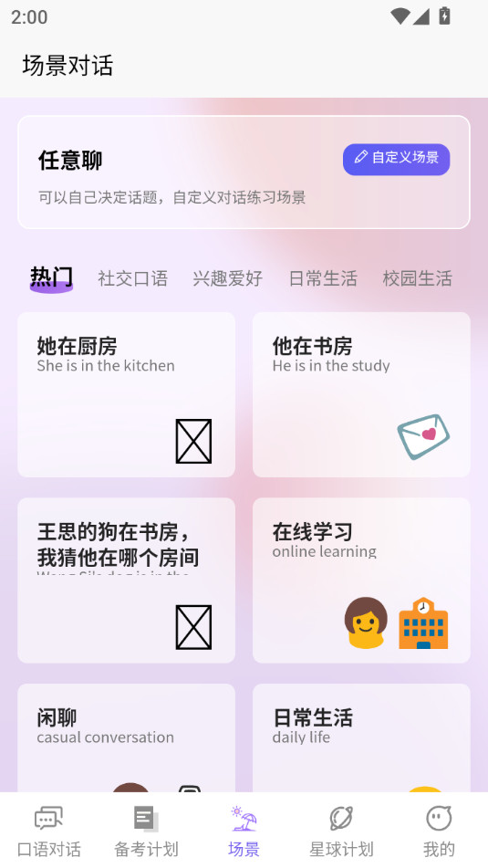 一款功能丰富、特色鲜明、使用便捷且高效的口语学习工具。无论是想要提高英语口语水平的成年人还是想要进行英语启蒙的儿童,都可以在这款应用中找到适合自己的学习内容和方式。提供了多种场景下的口语陪练功能,用户可以根据自己的需求选择合适的场景进行练习,如日常生活、商务交流、旅游出行等。