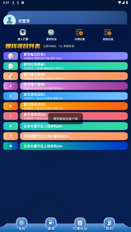 登录星空赚动打开星空应用搜索后会有华为、小米、oppo、vivo等各类机型下载任务,接受任务开始做单;