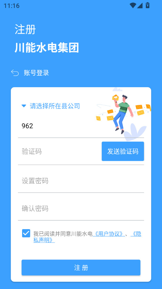 下载安装并打开川能水电app,点击没有账号去注册