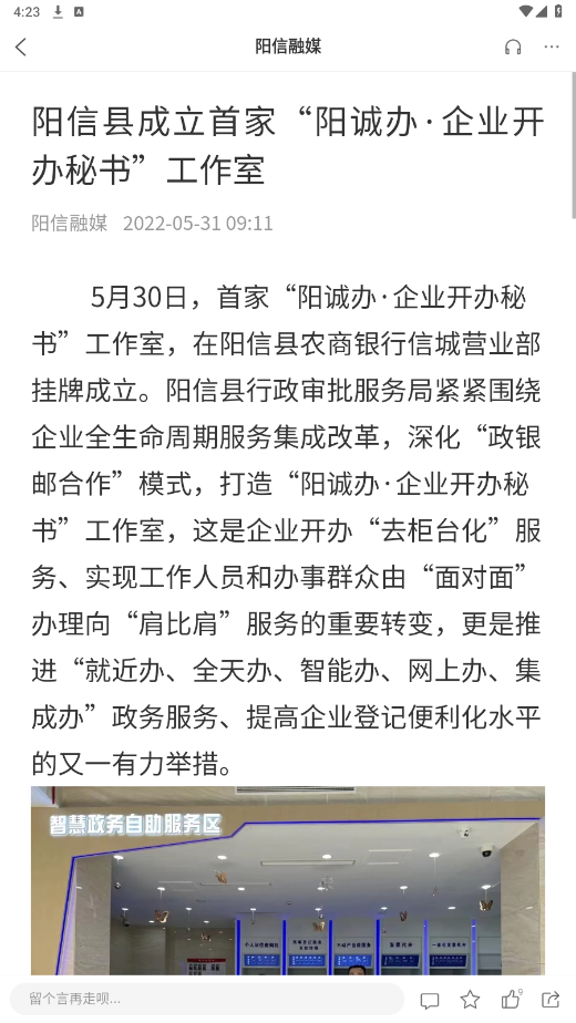 实时资讯更新:阳信融媒APP每日实时更新本地和国内资讯,让用户足不出户就能掌握阳信县的大小事务,了解国内外新闻动态。