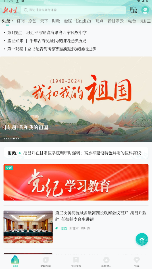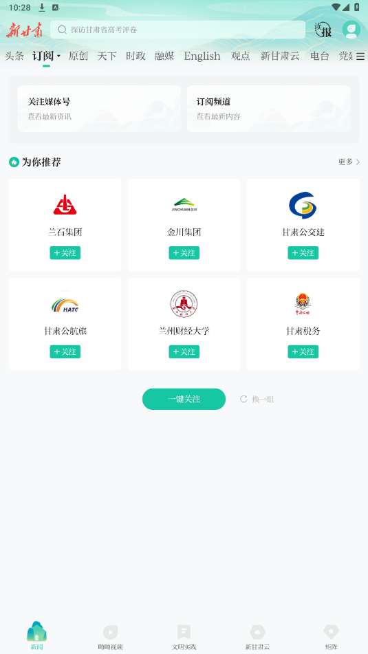 1、首页功能区聚合甘肃新媒体集团旗下各大门户的全平台资讯,下设头条、推荐、天下、壮阔40年、新视觉、城事儿、新农村、新经济、新观点、新校园、心旅游、生活家、文化等频道。