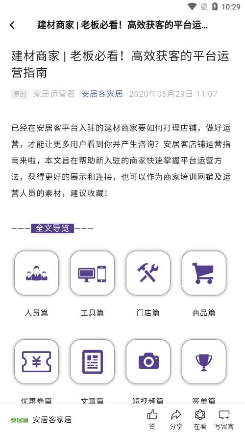 1、对于已经入驻安居客平台的装修商家,安居乐装也提供了详细的店铺运营指南。