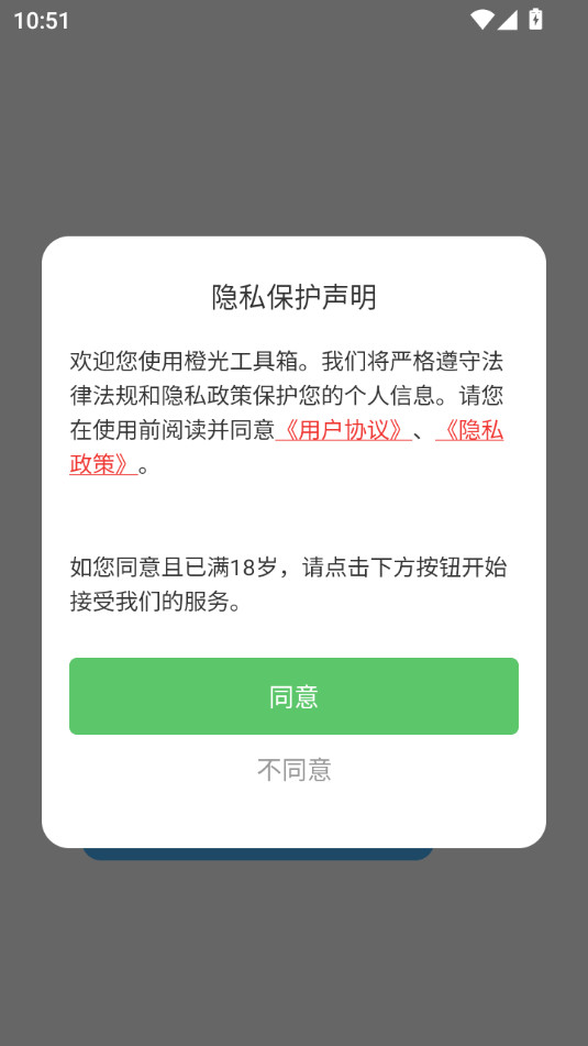 下载安装并打开橙光工具箱app,点击同意